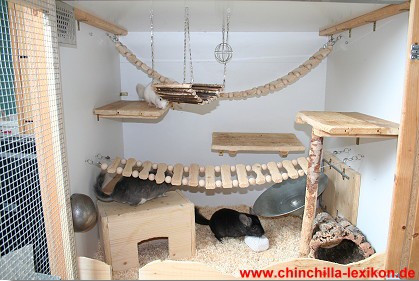 - Très actifs et dynamiques, les chinchillas ont besoin d'une grande cage à plusieurs niveaux. Par manque d'exercice ils peuvent adopter des comportement délétères comme l'arrachage des poils, d'où des risques trichobézoards (boules de poils se formant dans l'estomac) donc de stase digestive et d'obésité.