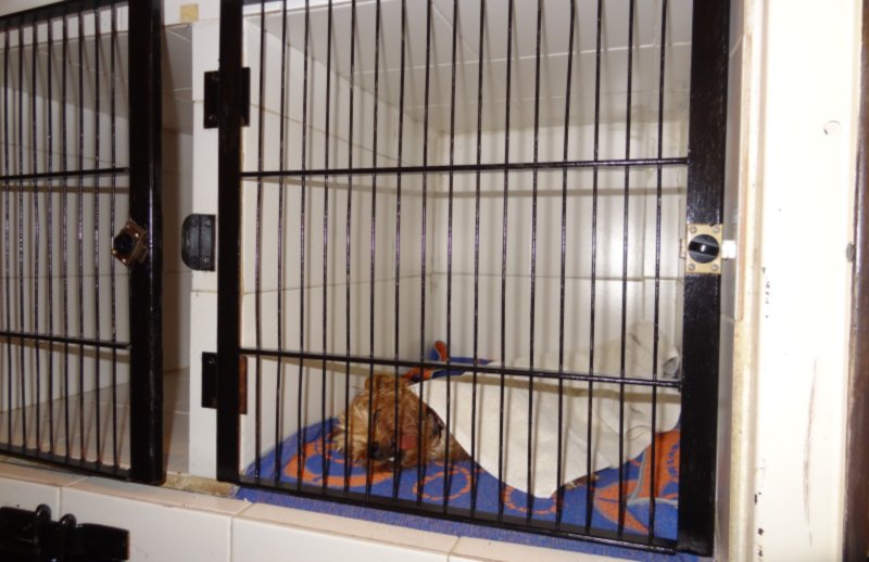 Nous arrivons maintenant dans la partie plus privée de la clinique. Il s'agit d’abord du chenil d’hospitalisation, avec ses cages individuelles pour chats et chiens.