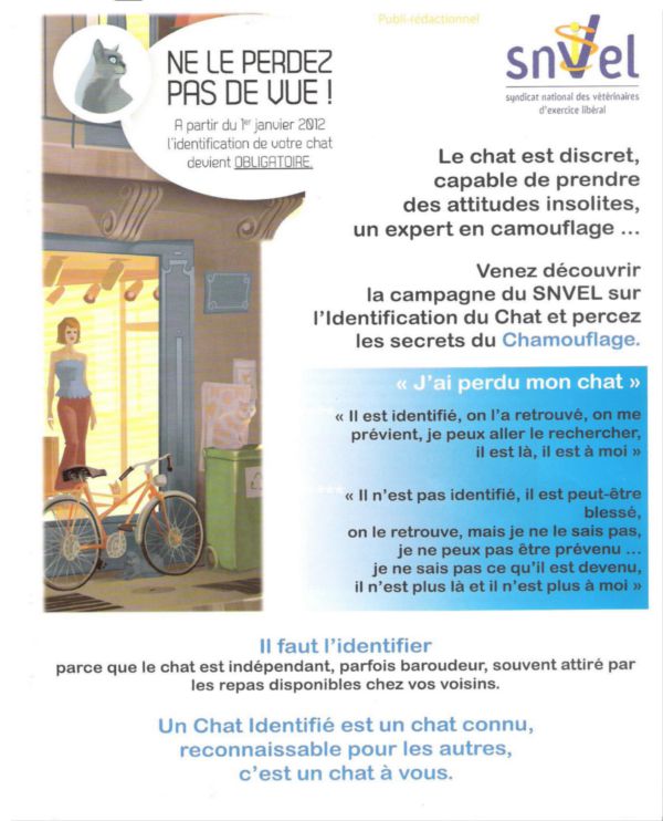 Depuis le 1er Janvier 2012, l'identification de tous les chats nés après cette date deviendra obligatoire avant l'âge de 7 mois. Cette loi a pour but de corriger une situation désastreuse : de nombreux chats perdus finissent dans des refuges surpeuplés où ils risquent l'euthanasie, simplement faute d'avoir pu être identifiés.